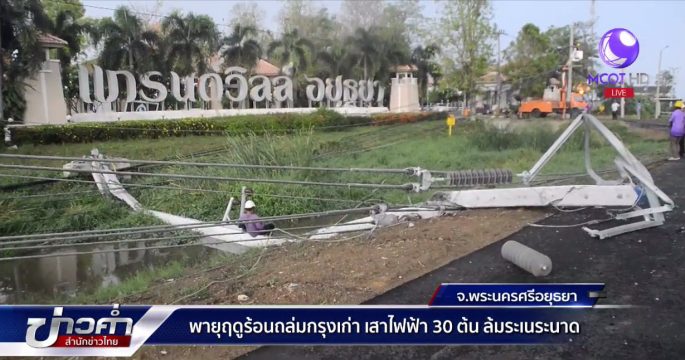 เมื่อช่วงเย็นที่ผ่านมาเกิดพายุฤดูร้อนพัดถล่มพื้นที่ จ.พระนครศรีอยุธยา ทำให้เสาไฟฟ้าแรงสูง 20 เมตร ล้มกว่า 30 ต้น กระแสไฟฟ้าดับเป็นวงกว้าง