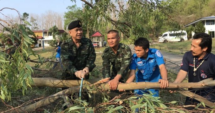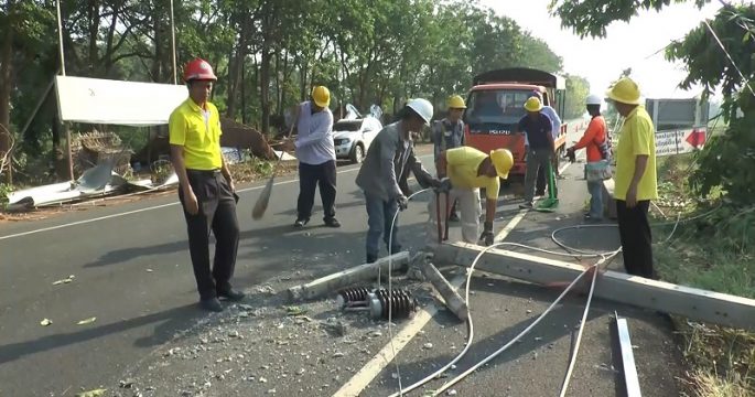 เจ้าหน้าที่การไฟฟ้าส่วนภูมิภาค ระดมเครื่องจักรกลหนักเข้าซ่อมแซมสายไฟและเสาไฟฟ้าที่หักโค่น 30 ต้น ริมถนนพหลโยธิน เส้นทางขาเข้าแม่สาย-เชียงราย จากเหตุพายุฤดูร้อนถล่มเมื่อช่วงเย็นวานนี้ เบื้องต้นคาดแล้วเสร็จไม่เกิน 20.00 น.วันนี้