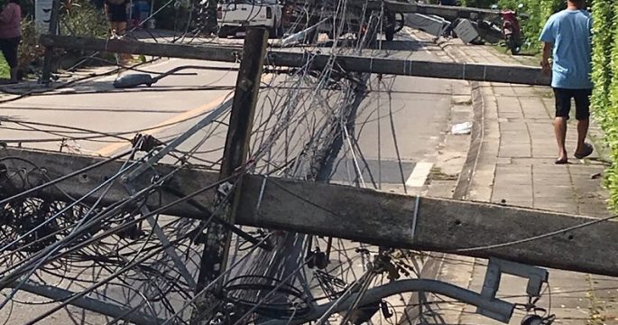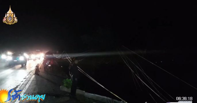 รถเครนเกี่ยวเสาไฟล้ม 9 ต้น ขวางซอยป่าหล่าย เมืองภูเก็ต ปิดสัญจรตั้งแต่บ่าย กฟภ.-เทศบาลตำบลฉลองเร่งเคลียร์ พบรถเสียหาย 5 คัน ไม่มีเจ็บ