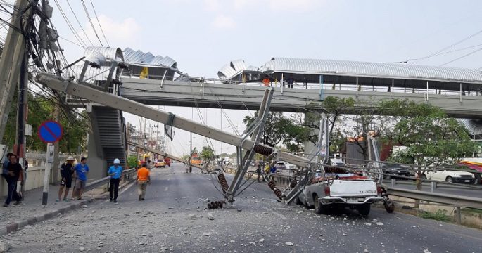 เจ้าหน้าที่เร่งเคลียร์อุบัติเหตุรถกระบะเสียหลักโค้งถนนย่านบางปู-สมุทรปราการ ชนเสาไฟล้ม 15 ต้น มีผู้บาดเจ็บและรถเสียหายหลายคัน คาดปักเสา-จ่ายไฟเข้าระบบได้ 02.00 น.