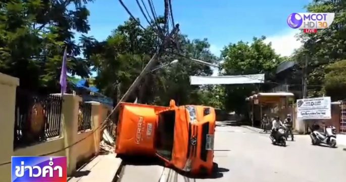 รถขนส่งพัสดุเกี่ยวสายสื่อสาร ทำเสาไฟล้ม-รถคว่ำ