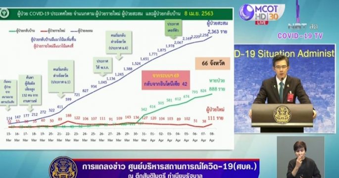 ศบค. แถลงสถานการณ์โควิด-19 พบผู้ป่วยเพิ่ม 111 ราย พบผู้ป่วยส่วนใหญ่กลับจากอินโดนีเซีย รวมผู้ป่วยสะสม 2,369 ราย เสียชีวิตเพิ่ม 3 ราย เสียชีวิตสะสม 30 ราย รักษาหายสะสม 888 ราย