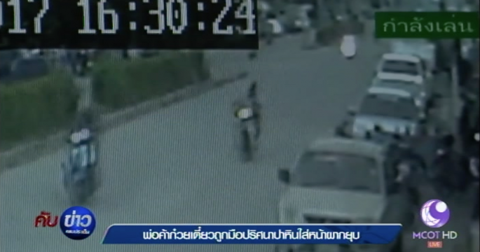 เปิดภาพวงจรปิด! พ่อค้าขายก๋วยเตี๋ยวถูกมือปริศนาปาหินใส่ขณะขี่รถจักรยานยนต์ จนเสียหลักล้มได้รับบาดเจ็บหน้าผากยุบ