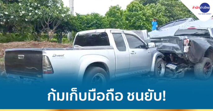 อุทาหรณ์! คนขับกระบะทำมือถือหล่นที่พักเท้า ก้มลงเก็บ รถเซไปชนรถที่จอดข้างทาง 2 คันรวด บาดเจ็บ 1 ราย