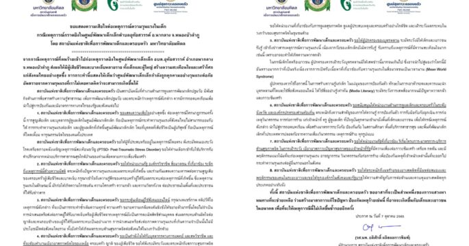 สถาบันแห่งชาติเพื่อการพัฒนาเด็กและครอบครัว มหาวิทยาลัยมหิดล ขอแสดงความเสียใจต่อเหตุการณ์ความรุนแรงในเด็ก กรณีกราดยิงในศูนย์เด็กเล็ก จ.หนองบัวลำภู