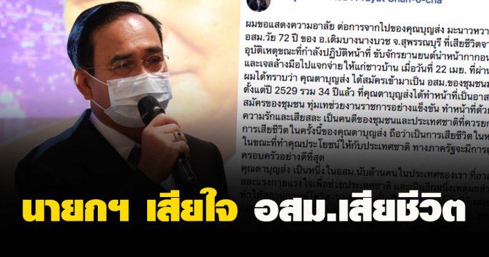 นายกฯ เเสดงความเสียใจ “บุญส่ง” อสม.วัย 72 ปี ชาวสุพรรณบุรี เสียชีวิตระหว่างขับจักรยานยนต์นำหน้ากากอนามัยและเจลล้างมือไปแจกจ่ายให้ชาวบ้าน ถือเป็นการสูญเสียบุคลากรที่มีค่า ยืนยันจะดูแลครอบครัวผู้เสียชีวิตอย่างดี พร้อมขอบคุณ อสม.ทุกคนที่ช่วยประเทศฝ่าวิกฤติโควิด