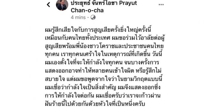 นายกฯ โพสต์เฟซบุ๊ก ระบุวันนี้ตั้งใจจะให้กำลังใจทุกคน บางครั้งการแสดงออกอาจทำให้หลายคนเข้าใจผิด แต่ในยามวิกฤต เชื่อกำลังใจเป็นสิ่งสำคัญ เราจะก้าวผ่านฝันร้ายนี้ไปด้วยกัน ด้วยหัวใจที่เป็นหนึ่ง