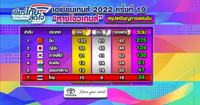 สรุปเหรียญทองเอเชียนเกมส์ จีน นำเป็นอันดับ 1 ส่วนไทยรั้งอันดับ 7 ส่วนโปรแกรมวันนี้ ลุ้นทีมชาติไทย วิ่งผลัด 4×100 เมตรชาย แข่งรอบชิงเวลา 20.25 น.