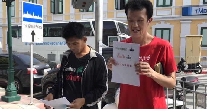 นายบุญเกื้อหนุน เป้าทอง ผู้ต้องหาตามหมายจับคดีขัดขวางขบวนเสด็จฯ”พระราชินี”มอบตัว ส่วนนายเอกชัย หงส์กังวาน ถูกจับแถวห้างดังย่านลาดพร้าว