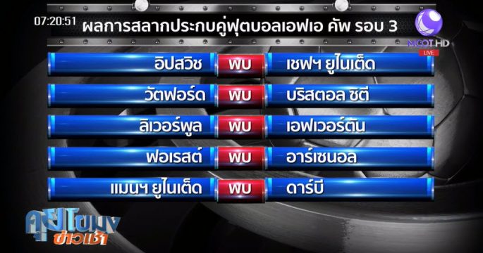 “หงส์แดง” ลิเวอร์พูล จะพบกับ “ทอฟฟีสีน้ำเงิน” เอฟเวอร์ตัน ส่วน “ปืนใหญ่” อาร์เซนอล แชมป์เก่า พบนอตติ้งแฮม ฟอเรสต์ ในศึกเอฟเอ คัพ อังกฤษ รอบ 3