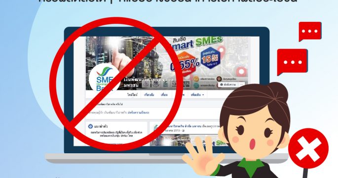 ธพว.เตือนเอสเอ็มอี ระหว่างแฟนเพจปลอมหลอกลวงโฆษณาสินเชื่อและบริการต่าง ๆ หวังหาผลประโยชน์ อย่าหลงเชื่อข้อมูล