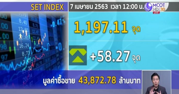 วันนี้หุ้นไทยเปิดมาพุ่งแรง ตอบรับกับจำนวนผู้ติดเชื้อโควิด-19 ในประเทศที่ชะลอตัว รวมถึงตลาดหุ้นฝั่งตะวันตกและในเอเชีย ล้วนขยับขึ้น โดยดัชนีช่วงเที่ยงปิด +58.27 จุด ที่ระดับ 1,197.11 จุด มูลค่าการซื้อขาย 43,872.78 ล้านบาท