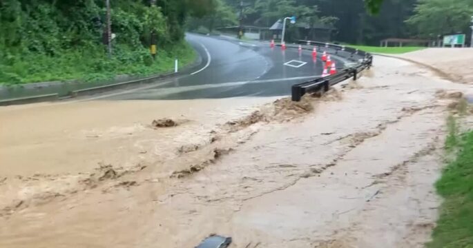 ถนนในเมืองวาจิมะในญี่ปุ่นกลายเป็นแม่น้ำหลังฝนตกหนัก