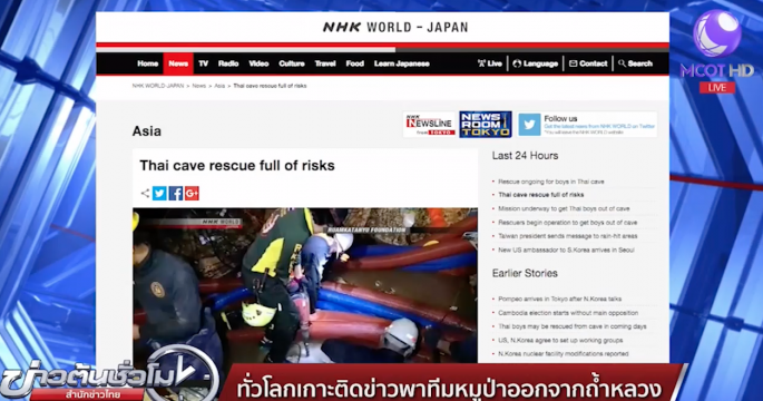 นอกจากคนไทยแล้ว ผู้ทั่วโลกก็ติดตามข่าวการนำทีมหมูป่าออกจากถ้ำหลวง โดยสำนักข่าวใหญ่ทั่วโลก ไม่ว่าจะเป็น ซีเอ็นเอ็น บีบีซี เอ็นเอชเค รอยเตอร์ส เอพี เอเอฟพี ต่างรีบเสนอข่าวด่วนในทุกช่องทาง