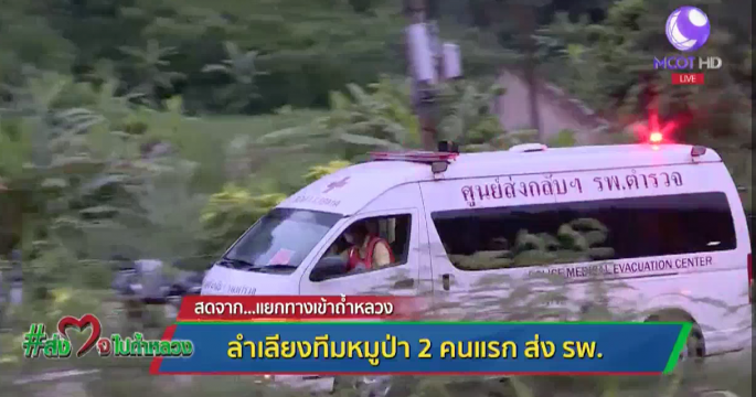 รถพยาบาล 2 คันแรกเคลื่อนตัวออกจากถ้ำหลวง ไปลานเฮลิคอปเตอร์ เมื่อเวลา 18.56 น. คาดพา 2 คนแรกทีมหมูป่าฯ ไปส่ง รพ.เชียงรายประชานุเคราะห์.-สำนักข่าวไทย