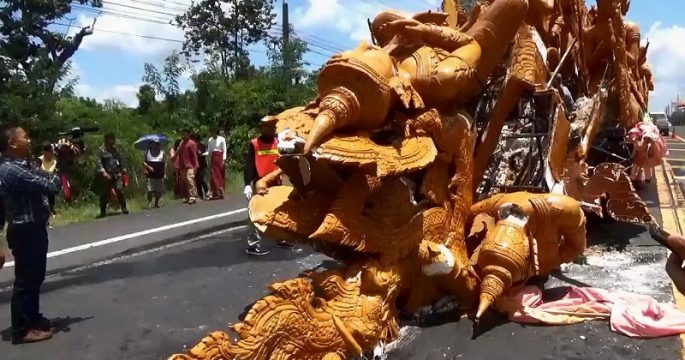 ต้นเทียนแกะสลักวัดเมืองเดช เกิดหักพังขณะเคลื่อนย้ายจาก อ.เดชอุดมจะไปตั้งโชว์ให้ชมก่อนที่สวนสาธารณะทุ่งศรีเมือง เทศบาลนครอุบลราชธานี เตรียมประกวดงานแห่เทียนพรรษาพรุ่งนี้ ด้านหัวหน้าช่างต้นเทียนคาดโครงสร้างรับน้ำหนักไม่ไหว เร่งปรับแก้ให้ทัน