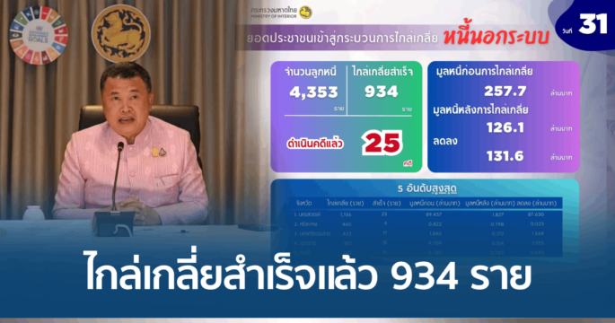 “มหาดไทย” เผยเหลือเวลารับลงทะเบียนหนี้นอกระบบอีก 18 วัน หลังครบ 73 วันของการเปิดรับลงทะเบียนหนี้นอกระบบ ประชาชนลงทะเบียนแล้วกว่า 1.4 แสนราย มียอดหนี้นอกระบบรวมกว่า 9,835 ล้านบาท ไกล่เกลี่ยสำเร็จแล้ว 13,089 ราย มูลหนี้ลดลง 675 ล้านบาท เน้นย้ำทุกพื้นที่เร่งดำเนินการไกล่เกลี่ยทันที