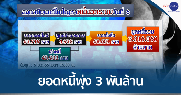 กรุงเทพฯ 7 ธ.ค. – ตัวเลขการลงทะเบียนหนี้นอกระบบรวม 6 วัน ยอดหนี้พุ่งกว่า 3,000 ล้านบาท ลูกหนี้เกือบ 70,000 ราย กทม. ลงทะเบียนมากที่สุด สงขลา รองลงมา รัฐบาลเปิดรับลงทะเบียนแก้ไขปัญหาหนี้นอกระบบ มาตั้งแต่วันที่ 1 ธันวาคมที่ผ่านมา มีลูกหนี้ทยอยมาลงทะเบียนต่อเนื่อง โดยกระทรวงมหาดไทย ได้เปิดเผยตัวเลขการลงเทียนตั้งแต่วันแรก ถึงเมื่อวานนี้ (6 ธ.ค.66) เวลา 15.30 น. พบว่ามีประชาชนลงทะเบียนรวมทั้งสิ้น จำนวน 68,651 ราย แบ่งเป็นการลงทะเบียนผ่านระบบออนไลน์ 63,719 ราย และการลงทะเบียน ณ ศูนย์อำนวยการแก้ไขหนี้นอกระบบ 4,932 ราย รวมจำนวนเจ้าหนี้ 40,903 ราย มีมูลหนี้รวม 3,316 ล้านบาท จังหวัดที่มีลูกหนี้มาลงทะเบียนมากที่สุด 5 ลำดับแรก คือ กรุงเทพฯ ลงทะเบียน 4,449 […]