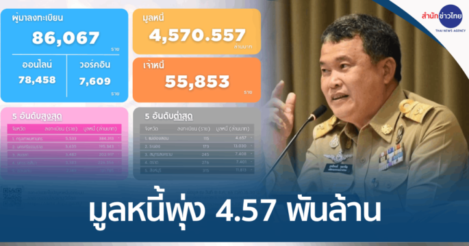 มหาดไทย เผยยอดลงทะเบียนหนี้นอกระบบ 11 วัน มูลหนี้ 4.57 พันล้านบาท ประชาชนลงทะเบียนแล้วกว่า 8.6 หมื่นราย เตรียมเรียกประชุมคณะกรรมการฯ เพื่อทบทวนแนวทางปฏิบัติและกำหนดมาตรการเพิ่มเติม 18 ธ.ค.นี้