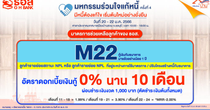 กรุงเทพฯ 16 ม.ค.-ธอส. ช่วยลูกค้า NPL ในงานมหกรรมร่วมใจแก้หนี้ฯ ครั้งที่ 4 จ.ชลบุรีนำโดย M22 ดอกเบี้ย 0% ต่อปี นาน 10 เดือน