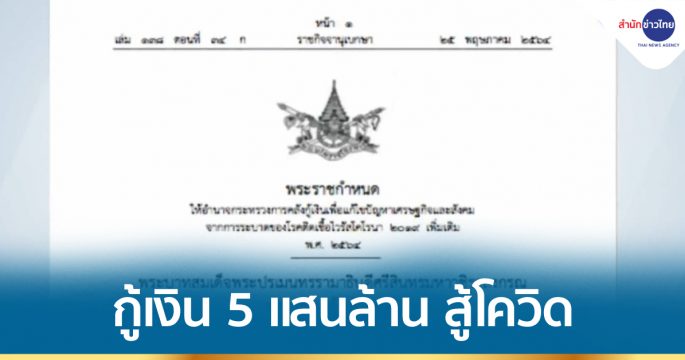 ราชกิจจานุเบกษาประกาศให้อำนาจ ก.คลัง กู้เงินฉุกเฉิน เพื่อแก้ไขปัญหาการระบาดของโรคโควิด-19 ช่วยเหลือ เยียวยา และชดเชยให้แก่ประชาชนทุกสาขาอาชีพ