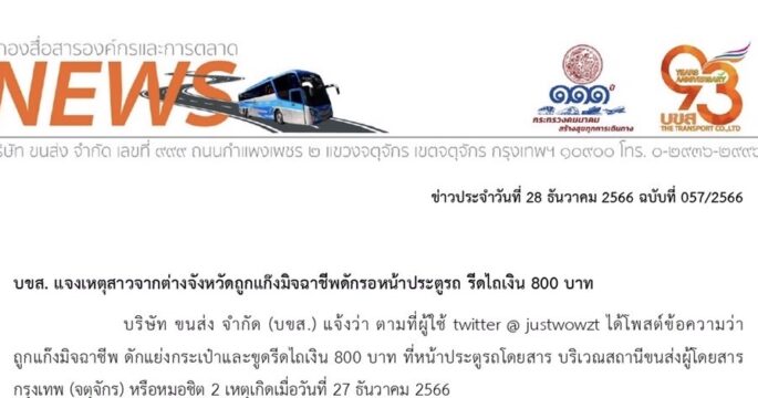 กรุงเทพฯ 28 ธ.ค.-บขส. แจงเหตุสาวจากต่างจังหวัดถูกแก๊งมิจฉาชีพดักรอหน้าประตูรถ รีดไถเงิน 800 บาท