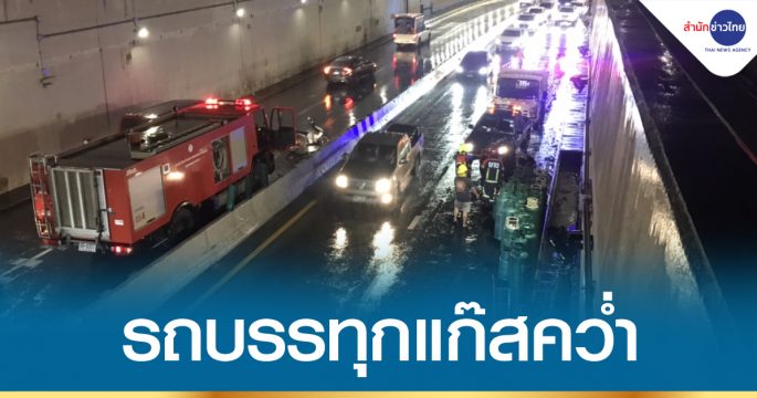 ระทึก! โชเฟอร์รถบรรทุกถังแก๊สซิ่งพลิกคว่ำในอุโมงค์เกษตร ช่วงฝนตกหนัก แก๊สรั่วไหล เจ้าหน้าที่ปิดถนนเคลื่อนย้ายรถและถังแก๊สได้อย่างปลอดภัย