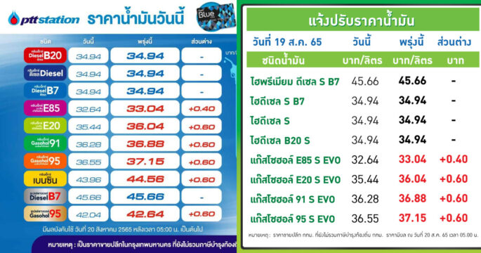 กรุงเทพฯ 19 ส.ค. – PTT Station-บางจากฯ ปรับราคาขายปลีกน้ำมันกลุ่มเบนซินและแก๊สโซฮอล์ทุกชนิดขึ้น 60 สตางค์/ลิตร เว้น E85 เพิ่มขึ้น 40 สตางค์/ลิตร ส่วนกลุ่มดีเซลคงเดิม มีผล 20 ส.ค. 2565 เวลา 05.00 น. เป็นต้นไป ราคาขายปลีก PTT Station จะเป็นดังนี้ ULG = 44.56, GSH95 = 37.15, E20 = 36.04, GSH91 = 36.88, E85 = 33.04, พรีเมี่ยม GSH95 = 42.64, HSD-B7 = 34.94, HSD-B10 = 34.94, HSD-B20 = 34.94, […]