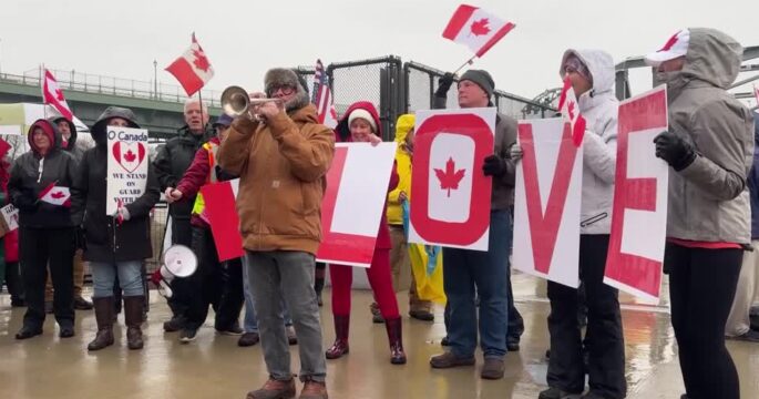 ชาวอเมริกันราว 200 คนฝ่าความหนาวเย็นออกมาชุมนุมกันที่เมืองบัฟฟาโล ในรัฐนิวยอร์กใกล้กับชายแดนาดาเพื่อให้กำลังใจและแสดงความเป็นอันหนึ่งอันเดียวกันกับชาวแคนาดา