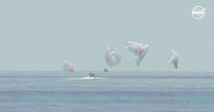 นักบินอวกาศขององค์การบริหารการบินและอวกาศแห่งชาติสหรัฐ หรือนาซา เดินทางกลับสู่โลกด้วยแคปซูลของสเปซเอ็กซ์ โดยวิธีกางร่มลงน้ำ