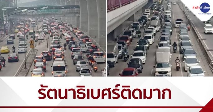 สวพ.FM 91 รายงานจราจรเช้าวันจันทร์ ถ.รัตนาธิเบศร์ ขาเข้า มุ่งหน้าแยกแคราย การจราจรติดขัดมาก ท้ายแถวสะสมสะพานพระนั่งเกล้า