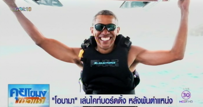 บารัค โอบามา ใช้เวลาว่างหลังพ้นจากตำแหน่งผู้นำสหรัฐ ด้วยการไปเล่น Kiteboarding กับเซอร์ ริชาร์ด แบรนสัน มหาเศรษฐีนักธุรกิจในทะเลแถบแคริบเบียน