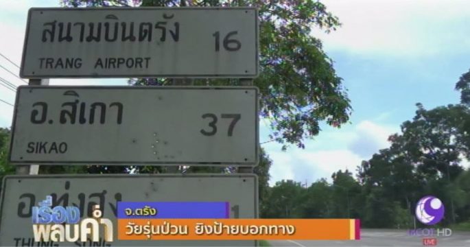 แขวงทางหลวงตรังเข้าแจ้งความ หลังถูกมือดีใช้ป้ายบอกทางเป็นเป้านิ่งซ้อมยิงปืน เมื่อคืนที่ผ่านมา ป้ายถูกยิงพรุนเสียหายกว่า 30 แผ่น