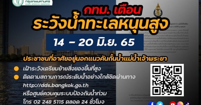 กทม.แจ้งเตือนเฝ้าระวังน้ำทะเลหนุนสูง 14-20 มิ.ย.นี้ ขอให้ประชาชนที่อาศัยอยู่นอกแนวคันกั้นน้ำแม่น้ำเจ้าพระยา เตรียมย้ายสิ่งของขึ้นที่สูง และติดตามเฝ้าระวังสถานการณ์น้ำอย่างใกล้ชิด