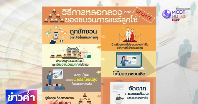 ดีเอสไอ-ธปท. แนะวิธีสังเกต “แชร์ออมเงิน” หรือ “แชร์ลูกโซ่” โดยรูปแบบมักอาศัยจังหวะประชาชนไม่อยากฝากเงินไว้กับธนาคารนานๆ และมองหาสินทรัพย์รลงทุน หรือ Search for yield ที่ให้ผลตอบแทนสูงมากๆ หากสังเกตก็จะเห็นว่าแชร์ลูกโซ่เหล่านี้ มักมีพฤติกรรมที่เหมือนกัน