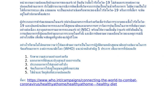 สภาอุตสาหกรรมอาหารทะเลนอร์เวย์ (NSC) แจงสื่อ “แซลมอน” ส่งออกปฏิบัติตามหลักอนามัย ปลอดภัย