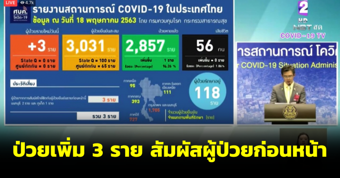 สถานการณ์โรคโควิด-19 ไทยพบผู้ป่วยรายใหม่ 3 ราย จากการสัมผัสผู้ป่วยยืนยันก่อนหน้า ผู้ป่วยสะสมเพิ่มเป็น 3,031 ราย หายป่วยแล้ว 2,857 ราย ไม่มีผู้เสียชีวิตเพิ่ม