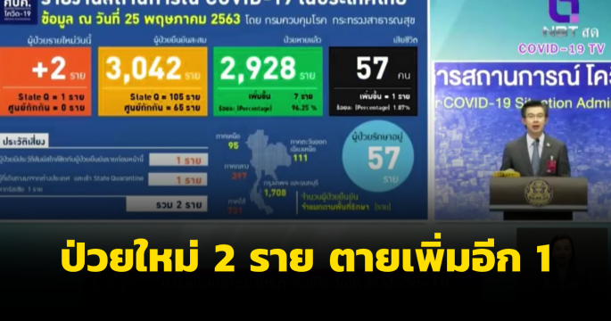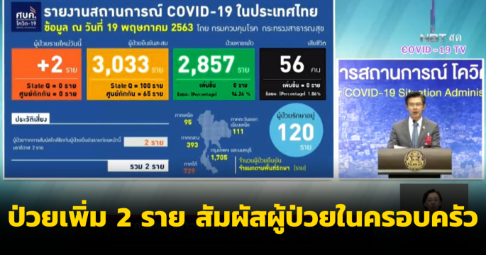 สถานการณ์โควิด-19 ในไทยพบผู้ป่วยรายใหม่ 2 ราย จากการสัมผัสผู้ป่วยก่อนหน้าในครอบครัวเดียวกัน ป่วยสะสม 3,033 ราย หายป่วยคงที่ 2,857 รายและไม่มีผู้เสียชีวิตเพิ่ม