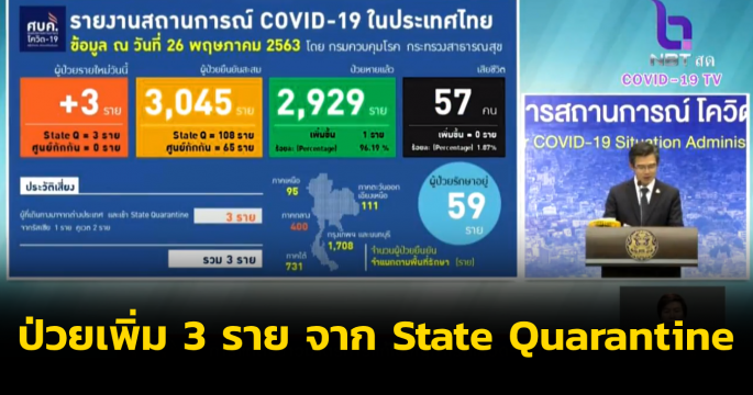 ไทยพบผู้ป่วยรายใหม่ 3 ราย กลับจากต่างประเทศและเข้า State Quarantine สะสม 3,045 ราย หายป่วยแล้ว 2,929 ราย รักษาในโรงพยาบาล 59 ราย เสียชีวิตคงที่ 57 ราย