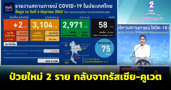 ไทยพบผู้ป่วยรายใหม่ 2 ราย มาจากต่างประเทศและเข้า State Quarantine ผู้ป่วยสะสม 3,104 ราย หายป่วยแล้ว 2,971 ราย รักษาในโรงพยาบาล 75 ราย ไม่มีผู้เสียชีวิตเพิ่ม