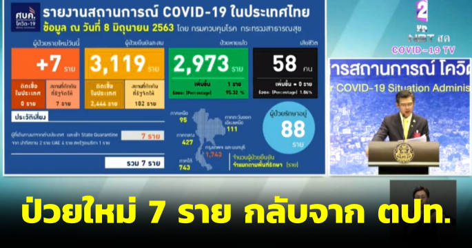 ไทยพบผู้ป่วยรายใหม่ 7 ราย กลับจากต่างประเทศ และเข้าพักที่ State Quarantine สะสม 3,119 ราย หายป่วยแล้ว 2,973 ราย รักษาในโรงพยาบาล 88 ราย ไม่มีผู้เสียชีวิตเพิ่ม