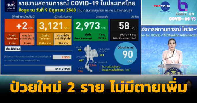ไทยพบผู้ป่วยรายใหม่ 2 ราย มาจากต่างประเทศและเข้า State Quarantine สะสม 3,121 ราย หายป่วยแล้ว 2,973 ราย รักษาในโรงพยาบาล 90 ราย ไม่มีผู้เสียชีวิตเพิ่ม