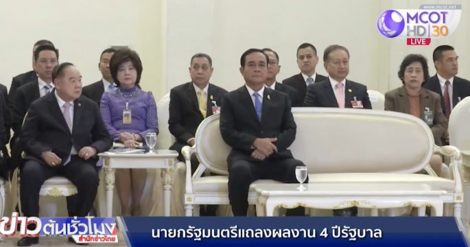 นายกรัฐมนตรี แถลงผลการทำงานขอรัฐบาลในรอบ 4 ปี โดยครั้งนี้ โดยครั้งนี้แถลงเพียงคนเดียว ใช้เวลาประมาณ 1 ชั่วโมง มีสื่อต่างชาติให้ความสนใจจำนวนมาก
