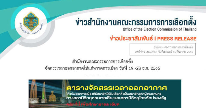 กกต. จัดสรรเวลาออกอากาศให้ 14 พรรคการเมืองแถลงผลงาน รวมระยะเวลา 5 วัน ระหว่าง 19 -23 ธ.ค.นี้