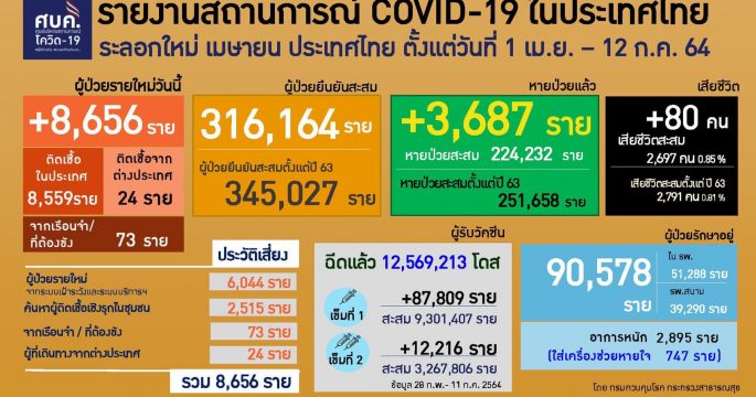 ศบค.พบติดเชื้อใหม่ 8,656 ราย เสียชีวิต 80 คน พบคลัสเตอร์ใหม่ 7 แห่ง ระบุยังพบการจัดงานเลี้ยงสังสรรค์ การรวมกลุ่มนับร้อยคน