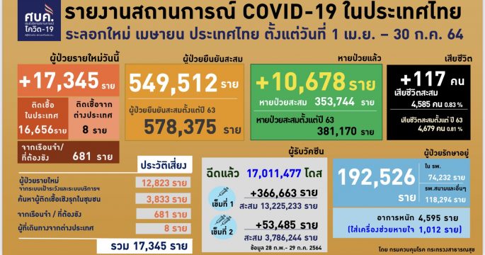 ศบค.เผยจำนวนติดเชื้อโควิด-19 ใหม่ 17,345 ราย เสียชีวิต 117 คน กทม.ยังติดอันดับมากสุด ปัจจัยเสี่ยงจากคนในครอบครัว ไปพื้นที่แออัดพบ 6 คลัสเตอร์ใหม่