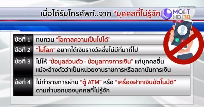 ศูนย์คุ้มครองผู้ใช้บริการทางการเงิน ธนาคารแห่งประเทศไทย เตือนประชาชนมาเป็นระยะ อย่าหลงเชื่อให้ข้อมูลส่วนตัวกับมิจฉาชีพ พร้อมคำแนะนำหากได้รับโทรศัพท์จากบุคคลที่ไม่รู้จัก