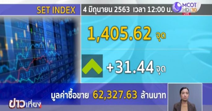 หุ้นไทยช่วงเที่ยง +31.44 จุด มูลค่าการซื้อขาย 62,327.63 ล้านบาท ตามตลาดหุ้นต่างประเทศที่ส่วนใหญ่ปรับตัวดีขึ้น รวมถึงมีแรงซื้อกลับเข้ามาในหุ้นของกลุ่มท่องเที่ยวและกลุ่มแบงก์เข้ามาอย่างต่อเนื่อง