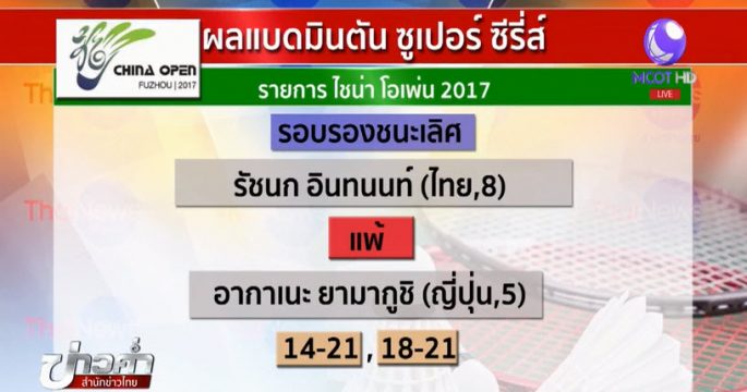 “ณิชชาอร จินดาพล” พ่าย นักตบลูกขนไก่เจ้าภาพ ตกรอบรองชนะเลิศ แบดมินตันโคเรีย มาสเตอร์ส 2017 ขณะที่ “นำโชค ตันติโภคากุล” รั้งอันดับ 3 ร่วม กอล์ฟเอเชียนทัวร์ที่จีน