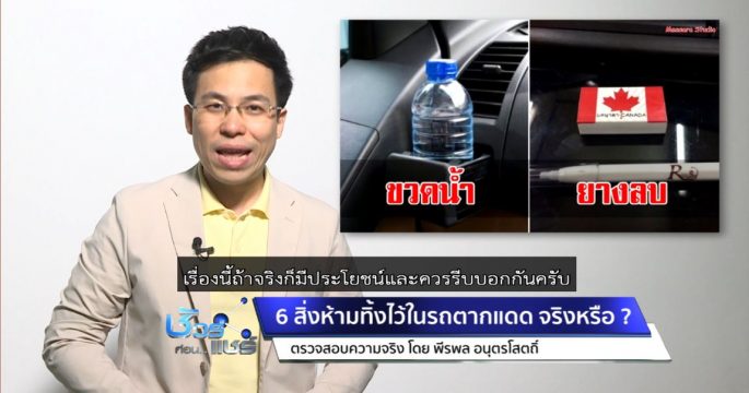บนสังคมออนไลน์แชร์เตือนให้ระวังการวางสิ่งของ 6 สิ่งไว้ในรถยนต์ที่จอดตากแดด ได้แก่ ไฟแช็ก กระป๋องสเปรย์ น้ำแข็งแห้ง ขวดน้ำดื่ม แบตเตอรี่ และยางลบ เรื่องนี้จริงหรือไม่ ติดตามจากศูนย์ชัวร์ก่อนแชร์